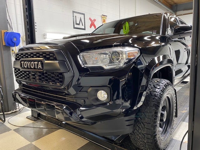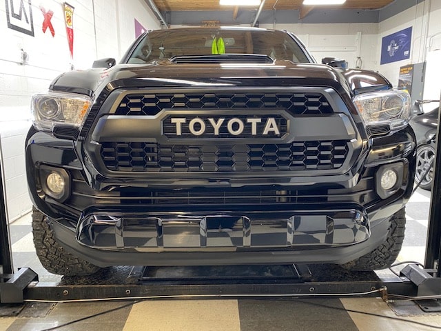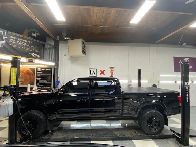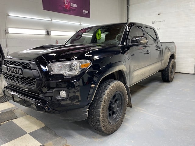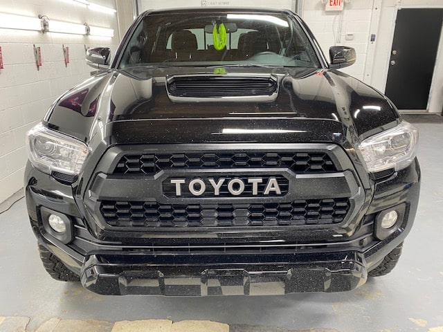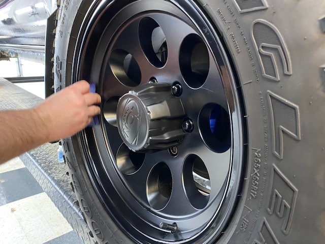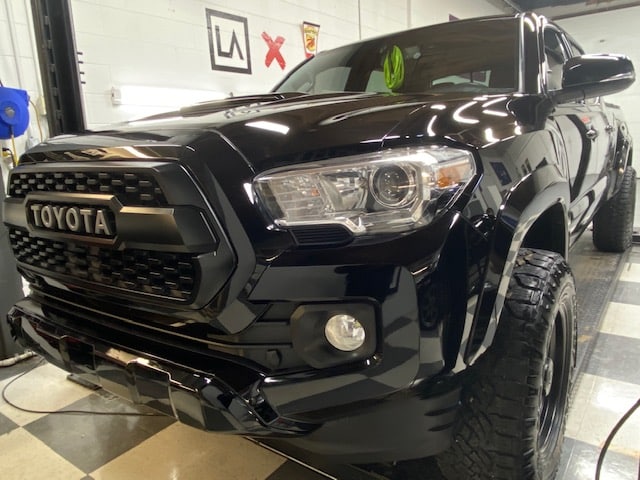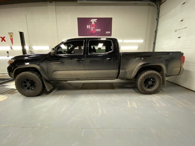 The ceramic coating we agreed upon using was the Gyeon Mohs + nano coating. It is very durable and hydrophobic. We applied it to the painted areas, plastics, wheel faces and the glass. You’ll notice the added gloss and depth that was added even after power polishing the paint. This Tacoma will be protected for years to come!